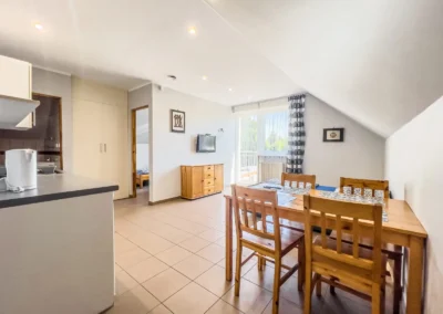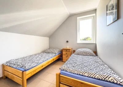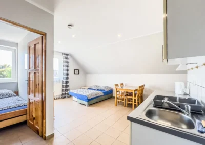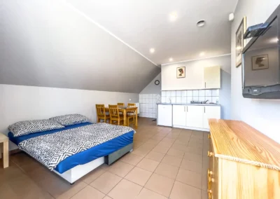Jest to studio, znajdujące się na pierwszym piętrze z dwoma pokojami i balkonem na stronę południową. W studio znajdują się dwa łóżka pojedyncze ,dwuosobowa wersalka oraz duża garderoba.. Studio jest w pełni przygotowane na plażowanie, dlatego na wyposażeniu znajdziesz również parawan i matę plażową. Nasi goście mogą również korzystać z zielonego terenu rekreacyjnego z tyłu pensjonatu, który zachęca do odpoczynku na trawie oraz wspólnego grillowania. Dla pełnej wygody zapewniamy bezpłatne miejsca parkingowe bezpośrednio na terenie posesji.